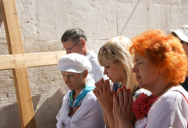 Сёння нашай мэтай быў Ерусалім. Агляд горада мы распачалі з удзелу ў св. Імшы ў касцёле Pater Noster, дзе паводле традыцыі Езус навучыў сваіх вучняў гэтай малітве да Бога Айца. Гэта настарэйшая, а таксама найважнейшая малітва хрысціян. Я меў прывілей цэлебраваць ў гэтым касцёле Імшу. Было вельмі хвалююча. Здаецца, што нідзе так, як тут – у гэтай святыні, мы не маліліся з такой вялікай пашанай і адкрытым сэрцам «Ойча наш»... Кожнае слова – і цябе пранізвае да драбніцы. Падчас Імшы я спрабаваў пераказаць нашым пілігрымам, што азначае гэта месца і якое яно сімвалічнае. Менавіта адсюль па ўсім свеце разышлася малітва Пана, якая і сёння яднае ўсіх: католікаў, праваслаўных, пратэстантаў... Кожная рэлігія мае штосьці падобнае да іншых. Нягледзячы на розныя разыходжанні ў літургіі, кульце, аддаванні хвалы: усе мы маем аднаго Айца ў небе, да якога звяртаемся аднымі і тымі ж словамі... На тэрыторыі, якая прылягае да святыні, знаходзяцца табліцы з тэкстам малітвы Ойча наш на розных мовах. Вялікай радасцю было для нас убачыць сярод гэтых 130 табліц сваю. Беларускую. Яе ўсталявалі 25 кастрычніка 2011 г. Ужо тры гады таму... Ад нашага гіда я пачуў цікавую гісторыю, звязаную з дошкай на польскай мове – гэта ўжо трэцяя дошка, усталяваная тут. Што здарылася з папярэднімі? Першая звалілася са сцяны і разбілася акурат ў дзень увядзення ў Польшчы ваеннага становішча (13 снежня 1981). Другую дошку напаткаў такі ж лёс 10 красавіка 2010 г. – дзень авіякатастрофы пад Смаленскам, у якой загінула 96 чалавек... Ці гэта супадзенне? Наўрад ці. Не, у Бога няма супадзенняў. Відавочна гэта быў нейкі знак, паказаны Панам...