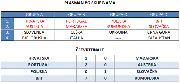Пуцёўкі ў фінал паміж сабой разыграюць зборныя з Босніі і Герцагавіны, Партугаліі, Харватыі і Славакіі. Беларусы разам з аўстрыйцамі і славенцамі былі пасеяны ў адзін кошык да гаспадароў турніра — харватаў. Зборная Харватыі ў выніку і выйшла з групы ў якасці лідара. Другое месца ў групе занялі аўстрыйцы.