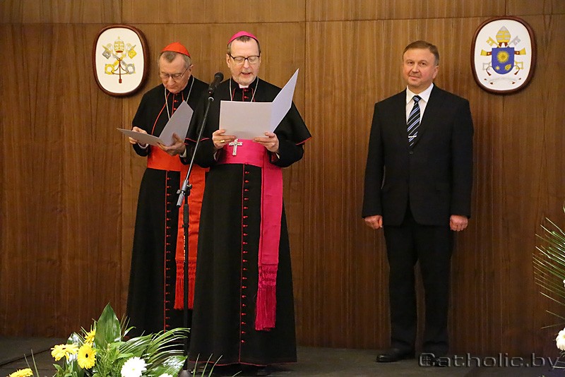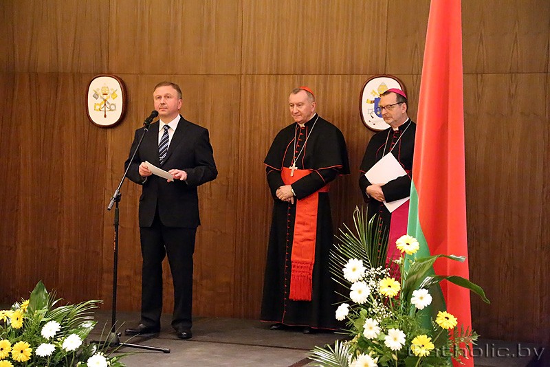 Прэм’ер-міністр Беларусі Андрэй Кабякоў ад імя ўраду Рэспублікі Беларусь і ад сябе асабіста сардэчна прывітаў усіх прысутных з нагоды другой гадавіны Пантыфікату Папы Францішка і візіту ў Беларусь кардынала П’етро Параліна. «Плённая дзейнасць Святога Пасаду, якая накіравана на распаўсюджванне ідэалу хрысціянства, ідэй чалавекалюбства, справядлівасці, дабра і міласэрнасці ва ўсім свеце, з’яўляецца найлепшым прыкладам самаадданага служэння людзям», — сказаў прэм’ер-міністр. «У Беларусі высока ацэньваюць духоўную місію Касцёла па захаванні агульначалавечых каштоўнасцяў у грамадзянскай свядомасці, — дадаў Андрэй Кабякоў. — Мы вельмі ўдзячныя Яго Святасці за асабістую ўвагу да развіцця супрацоўніцтва з нашай краінай і добрае стаўленне да незалежнай беларускай дзяржавы».