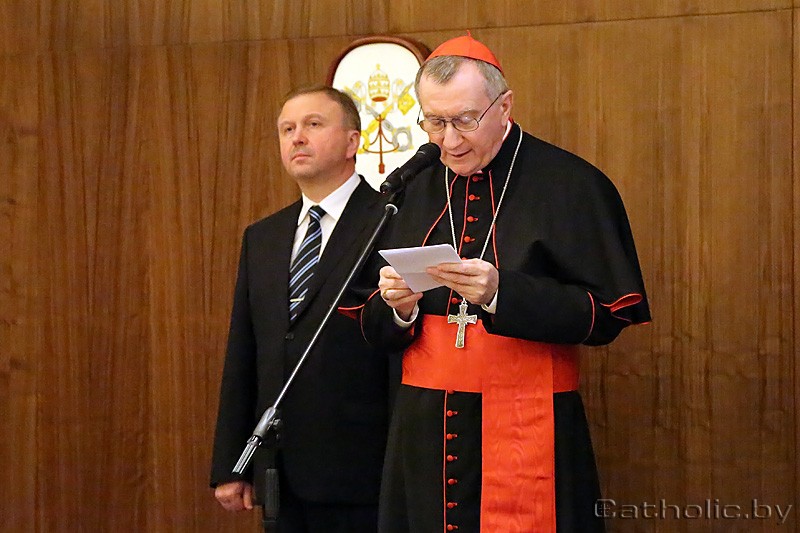 Дзяржаўны Сакратар дадаў, што Каталіцкі Касцёл «унёс і працягвае ўносіць не толькі тэарэтычны, але і канкрэтны ўклад, дзень за днём ажыццяўляючы служэнне гэтаму народу і дапамагаючы яму будаваць сваю будучыню». «Папа выражае, у прыватнасці і гэтым маім візітам, сваю велізарную ўдзячнасць каталіцкай супольнасці за яе ролю ў гісторыі, у маральным і грамадзянскім узрастанні беларускага народа», — сказаў кардынал. Дзяржаўны Сакратар звярнуў увагу, што «пакуты суседняй Украіны, так цесна і адчувальна звязанай роднаснымі і гістарычнымі сувязямі з беларускім народам, — гэта наглядны напамін аб жахах вайны і аб тым, што калі мір звесці толькі да крохкай раўнавагі матэрыяльных інтарэсаў, гэта можа раптоўна прывесці да найбольш жорсткага і бесчалавечнага насілля». «Святы Пасад высока ацэньвае намаганні беларускіх уладаў пакласці канец гэтаму канфлікту, каб прадухіліць яшчэ больш трагічныя наступствы», — падкрэсліў кардынал. Поўны тэкст прамовы Дзяржаўнага Сакратара>>> Іерарх перадаў сабраным «найлепшыя пажаданні Беларусі» і выказаў надзею, што «ўвесь свет, пакліканы ўзбагаціцца культурным, маральным і духоўным здабыткам гэтай краіны, падтрымае яе ўпэўненыя намаганні, накіраваныя на ўмацаванне годнасці кожнай чалавечай асобы і ўсяго народа ў цэлым».