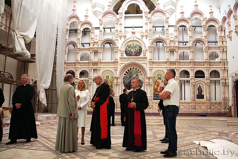 Для кардынала і каталіцкай дэлегацыі, а таксама прысутнага пасла Аўстрыі ў Беларусі Бернда Аляксандра Баерля, протаіерэй разам з жонкай правялі адмысловую аглядную экскурсію па царкве і яе інтэр’ерах.