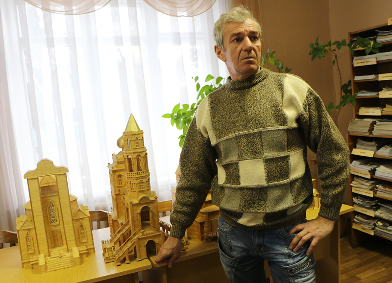 «Царква, па якой зроблены гэты макет, пабудавана дзесьці пад Масквой, а макеты тых дзвюх святыняў я прыдумаў сам», — гаворыць Станіслаў Зялкоўскі, паказваючы на склееныя са звычайных запалак макеты цэркваў і касцёлаў.