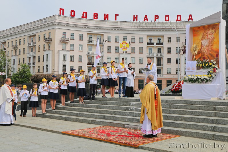 Эўхарыстыя – шлях да сапраўднага адзінства Першым прыпынкам працэсіі стаў алтар на плошчы Перамогі. Тут, каля абеліска, успомніўшы прыклад еднасці розных народаў падчас Вялікай Айчыннай вайны, католікі памаліліся аб дары еднасці для ўсіх людзей у сучасным свеце. Прыкладам еднасці для хрысціян з’яўляецца Святая Тройца. Менавіта ў такім боскім адзінстве, паводле гаміліі а. Аляксандра Шамрыцкага МІС, якую вернікі змаглі пачуць на плошчы Перамогі, заключана «бескарыслівая любоў, якая яднае ў адно цэлае тры Божыя Асобы».